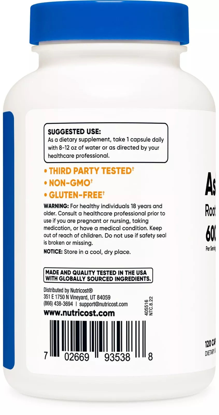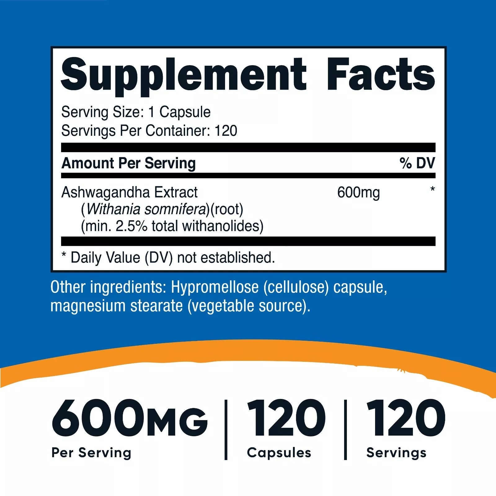 Nutricost Ashwagandha 600mg – 120 kapsułek | Naturalne wsparcie dla stresu, snu i energii | Bez GMO i glutenu