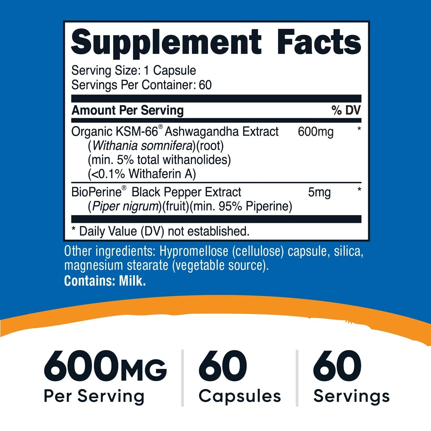 Nutricost KSM-66 Ashwagandha to zaawansowany suplement diety zawierający organiczny ekstrakt z korzenia ashwagandhy KSM-66 – najczystszej i najlepiej przebadanej formy ashwagandhy na rynku. Wzbogacony o BioPerine® dla lepszego wchłaniania, oferuje skuteczne wsparcie dla organizmu w radzeniu sobie ze stresem, poprawie energii, koncentracji oraz jakości snu.