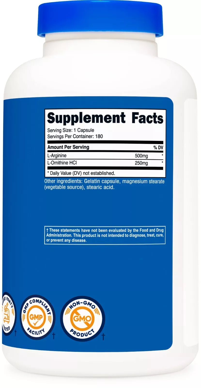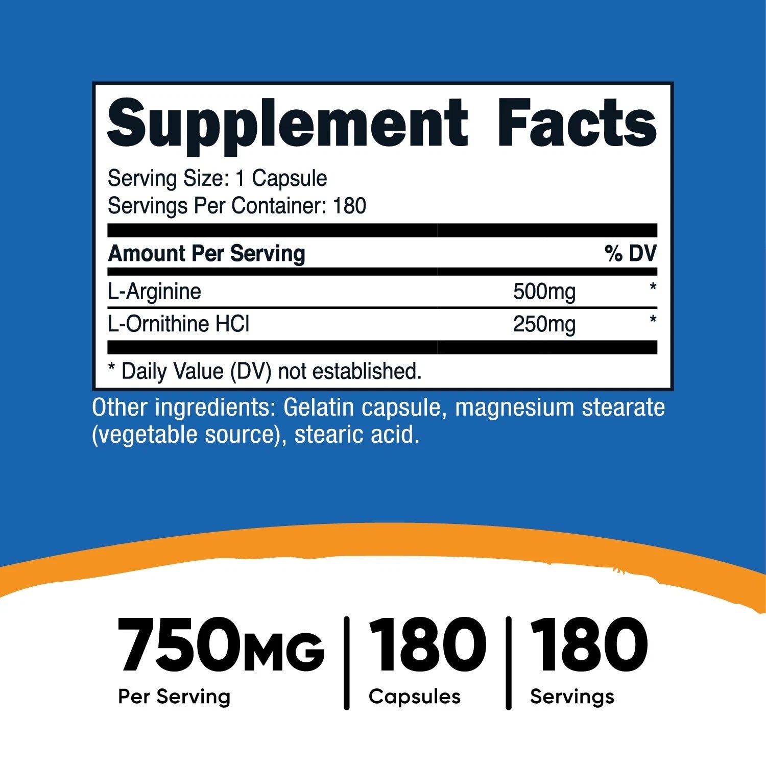 Nutricost L-Arginina + L-Ornityna 750 mg – 180 kapsułek | Wsparcie codziennej aktywności